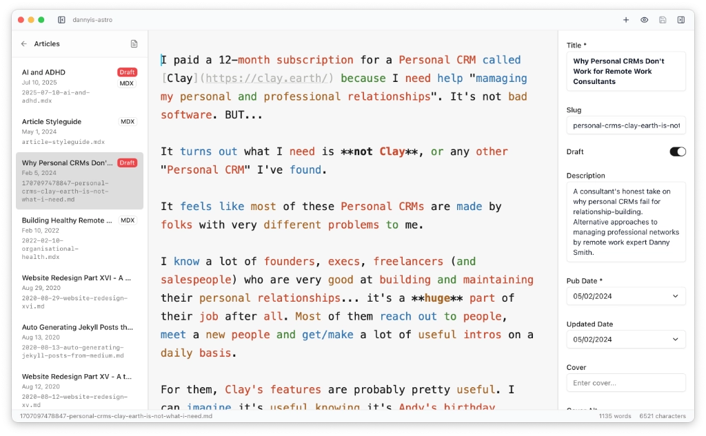 Astro Editor is the result, a free macOS app for writing markdown – its frontmatter – and MDX in Astro content collections.