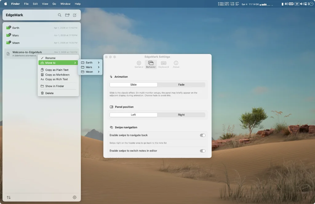 - EdgeMark for macOS exists because of SideNotes, as mentioned in Markdown Link No. 14, a notes panel that slides in from the screen edge. While SideNotes is closed-source and paid, with no way to customise, or verify what it does with your data. Therein lies the point: where exactly is your data? I could find the backup notes (not in an obvious readable format) but I could not find where it stored my notes, even with the iCloud option turned on. Your notes are buried away in an sqlite instance. EdgeMark is the open-source alternative: lightweight, markdown-first, and yours to inspect, modify and extend. Your notes are plain