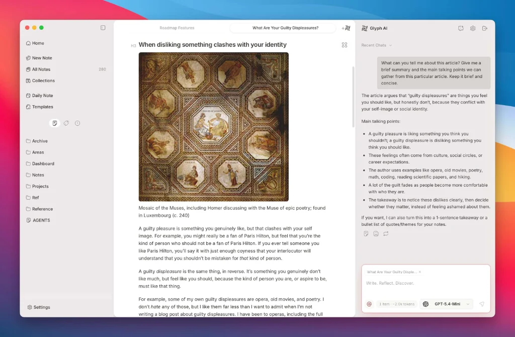 - Open-source Glyph (macOS, seven-day trial) allows you to write in markdown, connect ideas with links, and keep everything local. Importantly, you let AI help only when you ask. (Turn off AI access in settings; it’s on by default.) It offers themes, daily notes, tables and boards from tags, file preview and git sync. Glyph is all a bit wonk at the moment: heading signifiers (h1-h6) don’t align with the actual headings, front matter doesn’t align with your document, and there’s no option to turn off the front matter that I can find. Many of these are small details, but I know they will drive some of us mad. $15 buys you lifetime access.