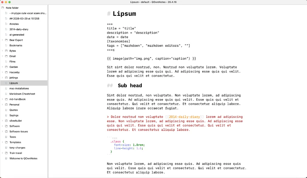 - Qownnotes, if it wasn’t for the bewildering array if settings, would be among the best markdown editors. Work your head around the settings – be patient – and you can eventually come up with something like the image above, source code mode, my preferred starting point. Despite having so many settings there is one thing missing, leading, or line-height, so you can adjust the type accordingly with the font-size and line-length chosen; line-length is described in Qownnotes as ‘editor width’ and you will find it under the ‘Window’ menu. But ‘editor width’ only works if you have switched off the ‘Only use editor width in distraction-free mode’, which appears under the ‘Editor’ settings. Told you, there are a lot of settings. Themes are another area that could be cleaned up. Offer users only two themes, light and dark, and allow them to choose from a library of themes rather than the 36 themes currently offered. Clean up your settings, please.